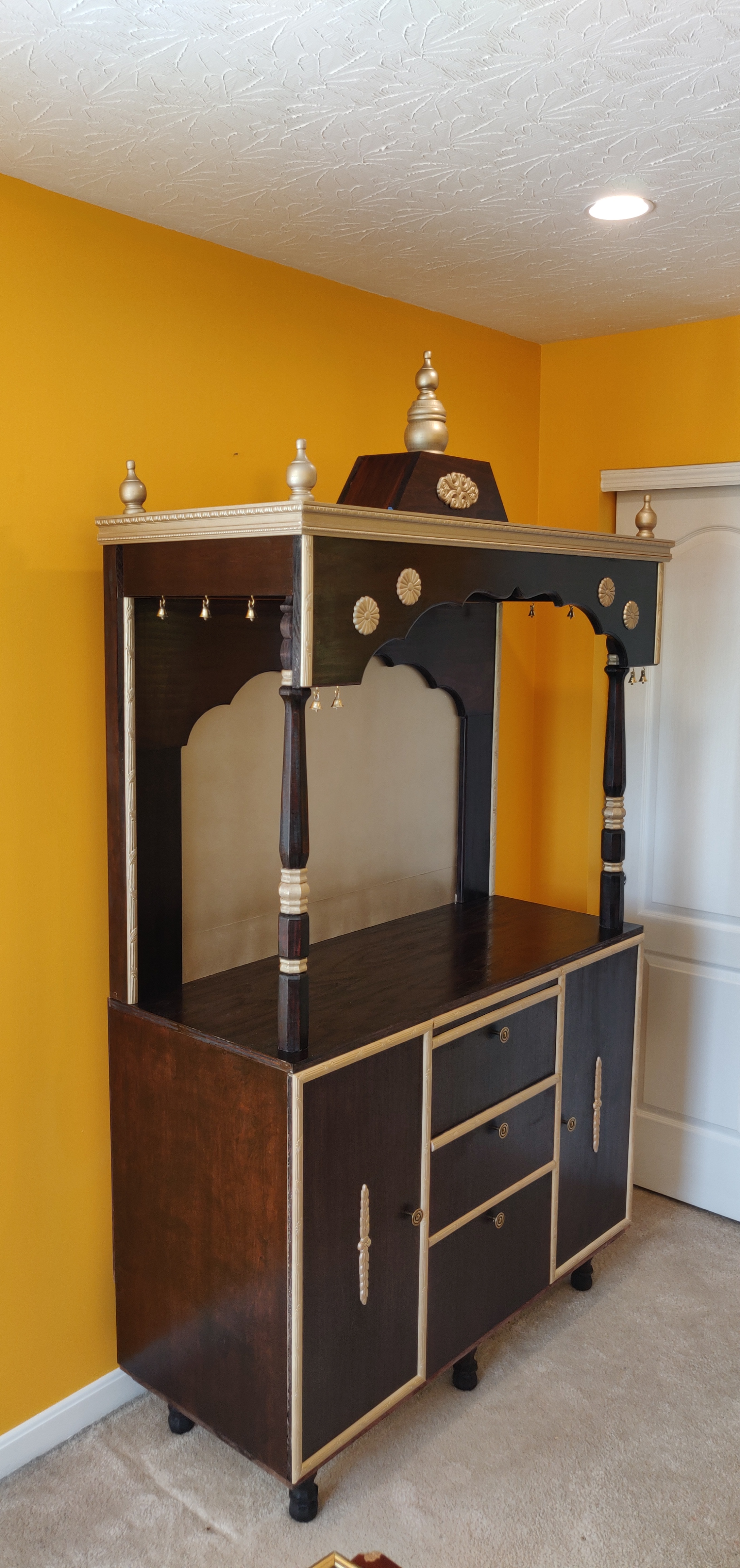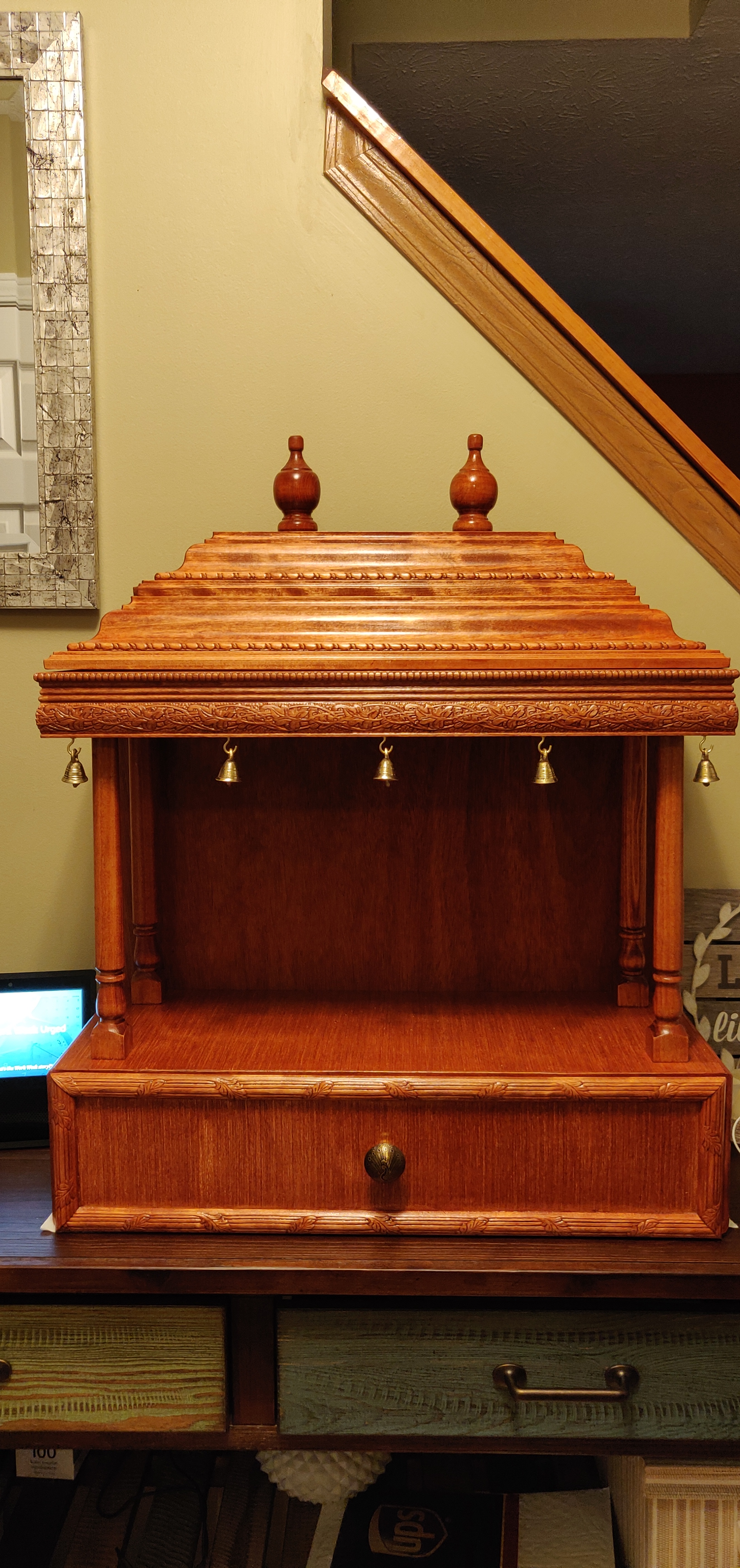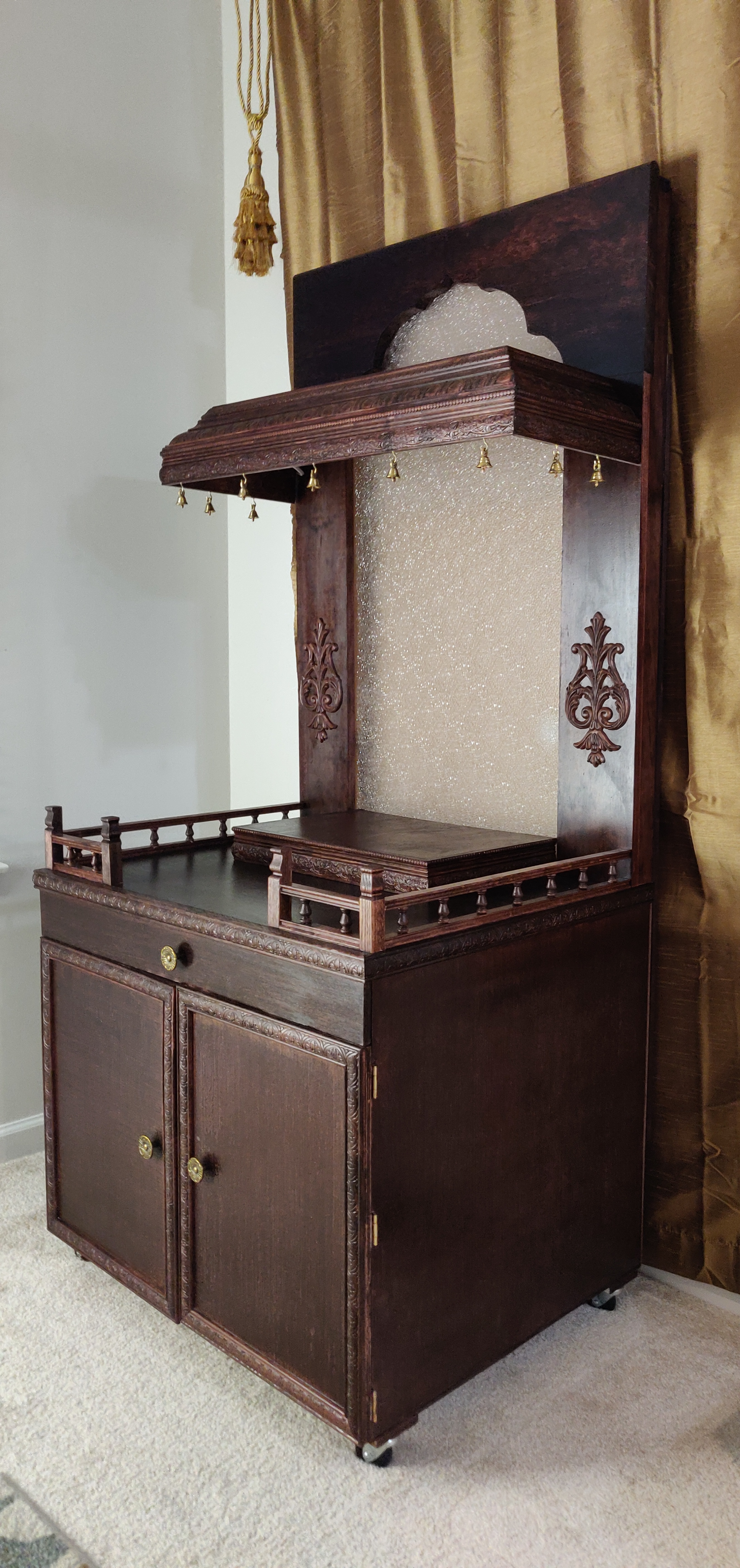 Our Mandirs are built with the highest quality materials and use high grade stains to get a beautiful finish. Mandirs are built using High Grade/Premium plywood along with Poplar and WhiteWood trim to ensure you have a solid piece of furniture that will last a lifetime! Visit us on Instagram for more models and options https://www.instagram.com/cincymandirs/